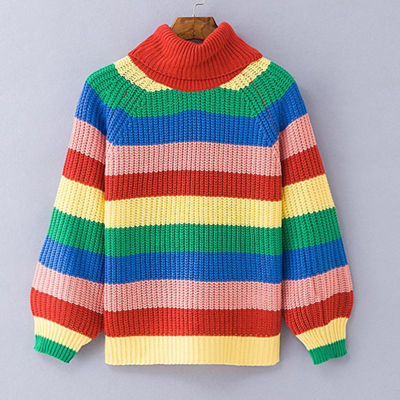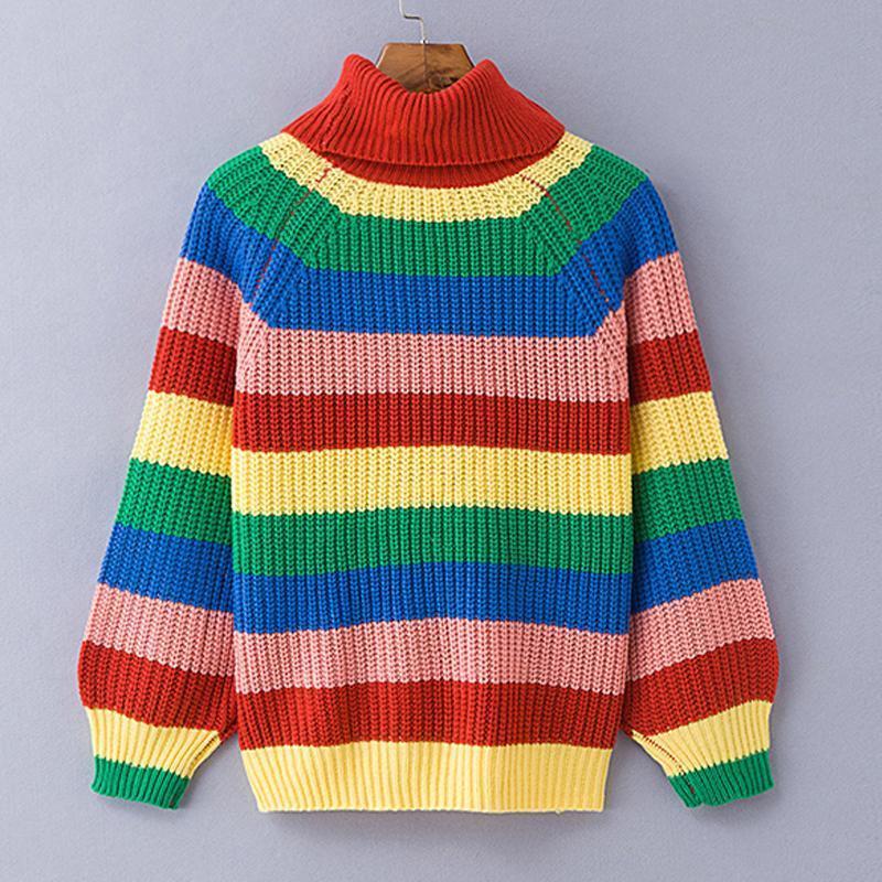 Rainbow Turtleneck Winter Jumpers Knitted Striped Oversize Pullover Sweater