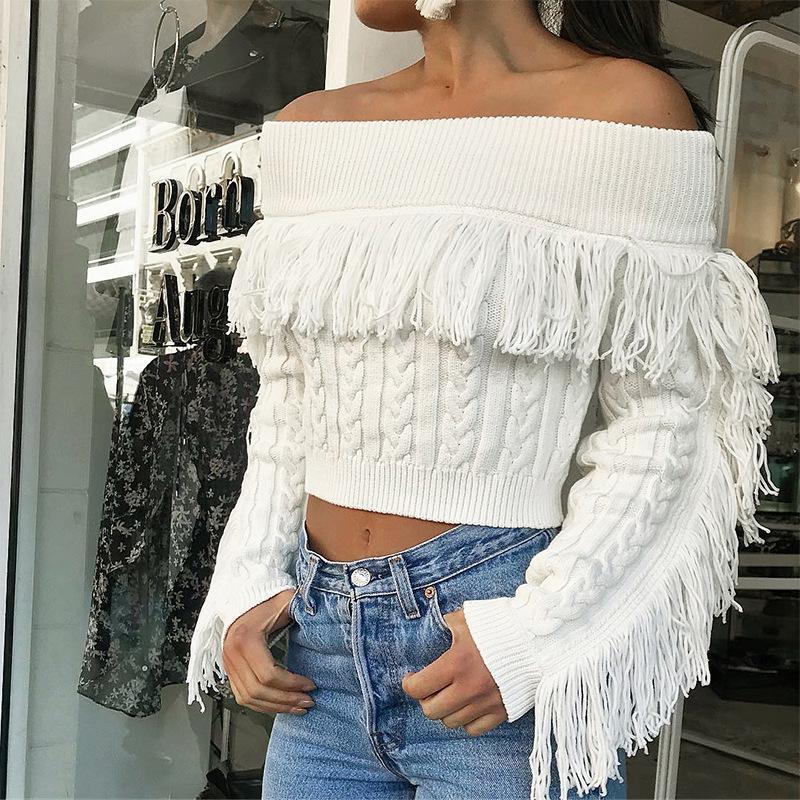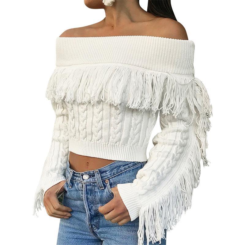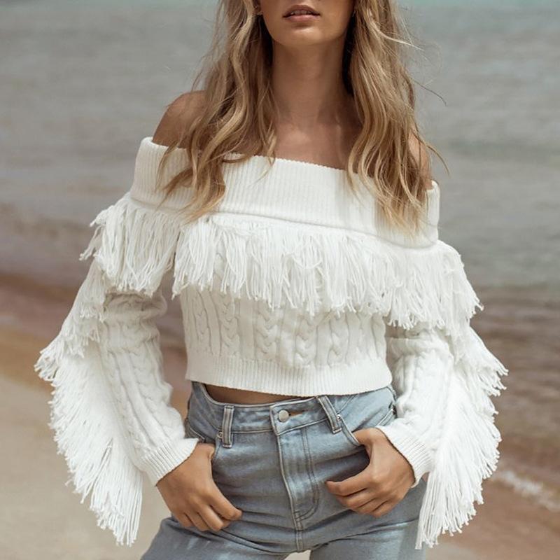 Tassel White Knitted Long Sleeve Sexy Pullover Short Sweater