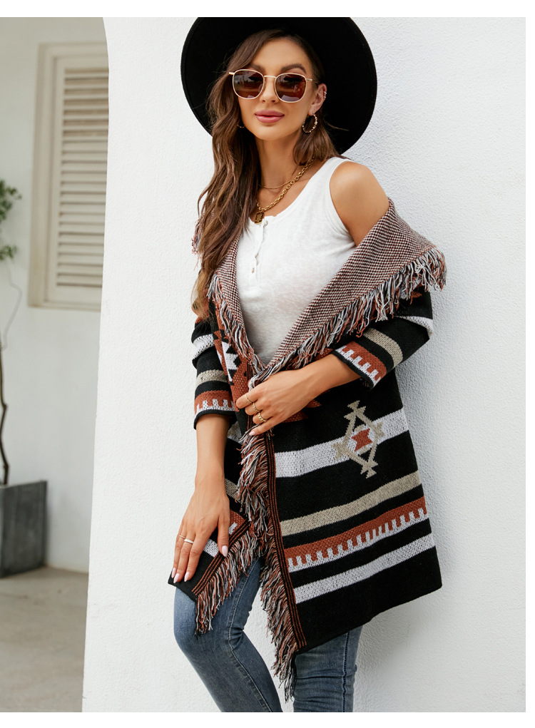 Autumn and Winter Loose Hooded Long Sweater Coat Tassel Geometric Jacquard Sweater Cardigan