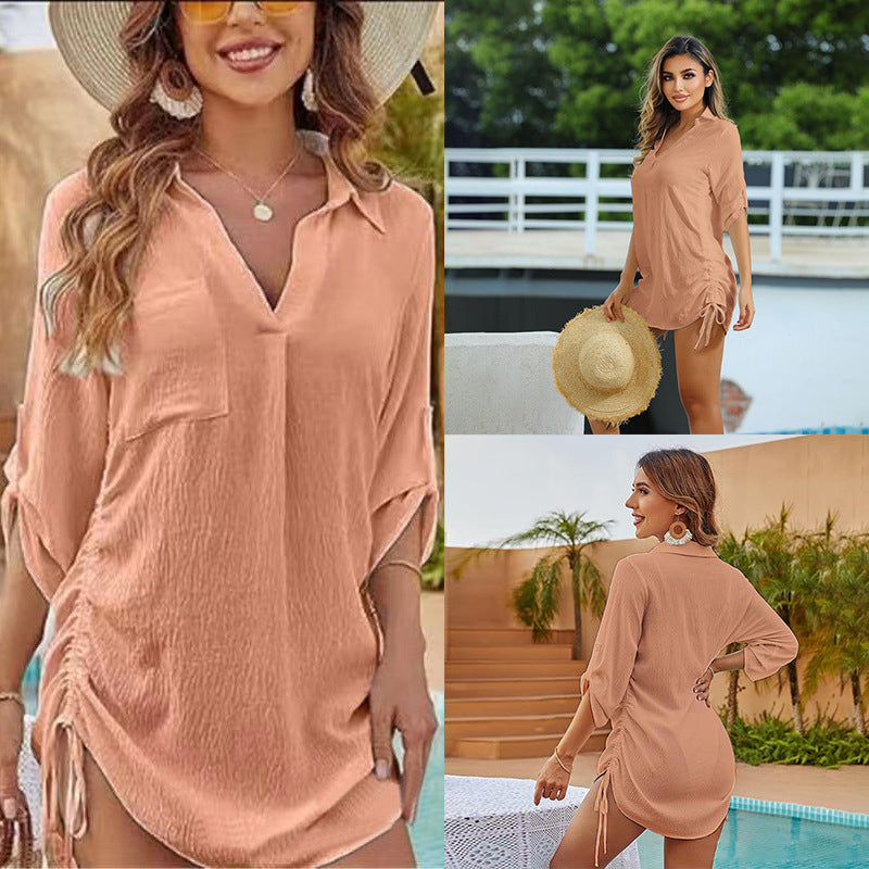 Drawstring Shirt Collar Beach Jacket Head Bikini Swimsuit Blouse Vacation Sunscreen Shirt