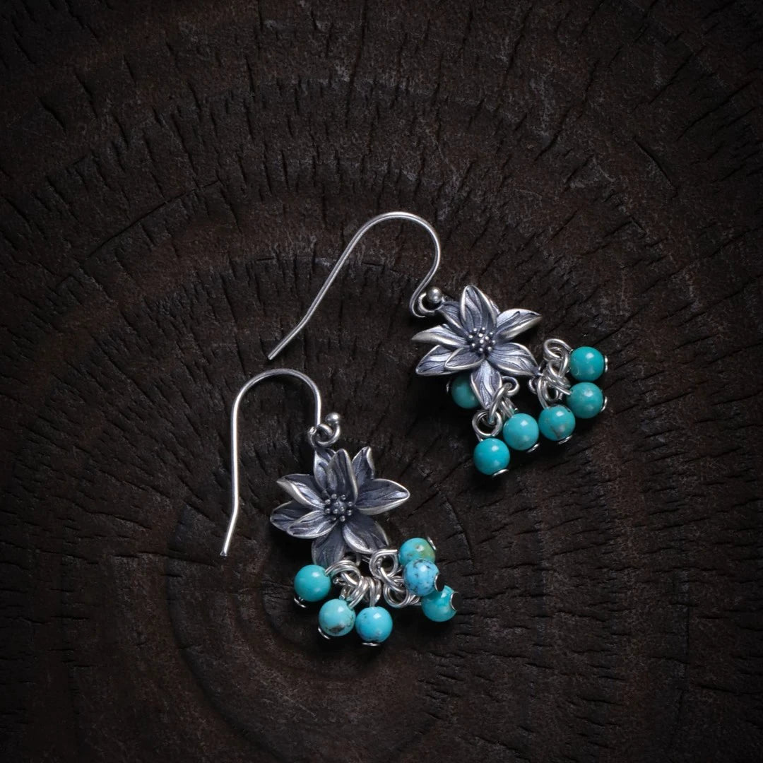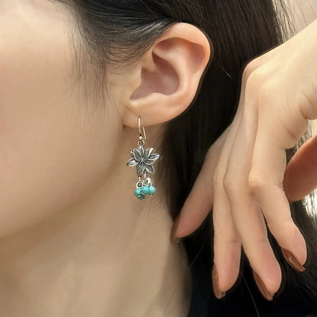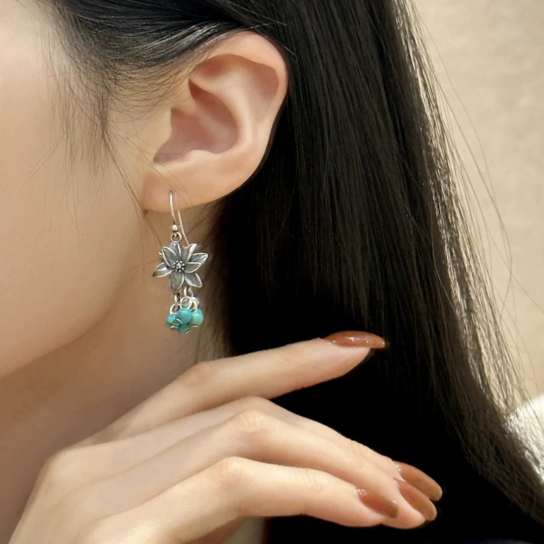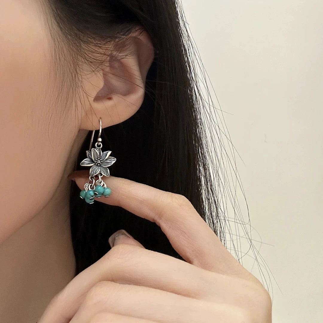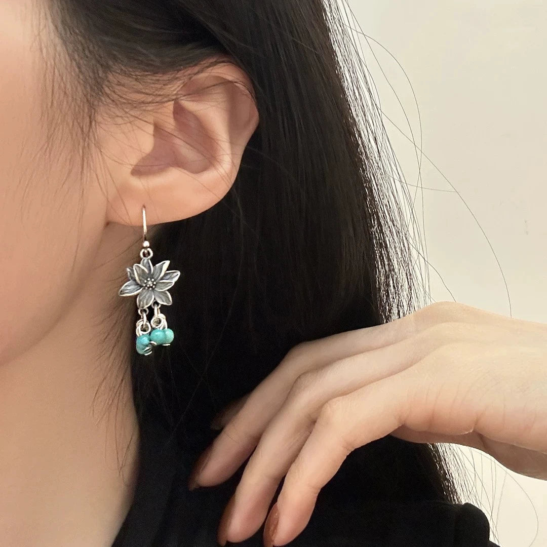 925 Silver Retro New Tibetan Lotus Fringed Turquoise Earrings Women's Ethnic Style Old Niche Design High Sense