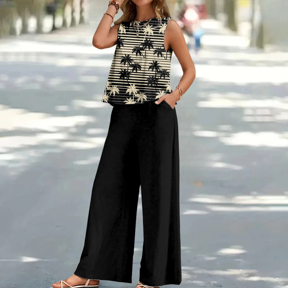 Bohemian Leaf Print Holiday Pants Set Round Neck Elegant Temperament Summer Sleeveless Top And Pants Hawaii Vacation Womenswear
