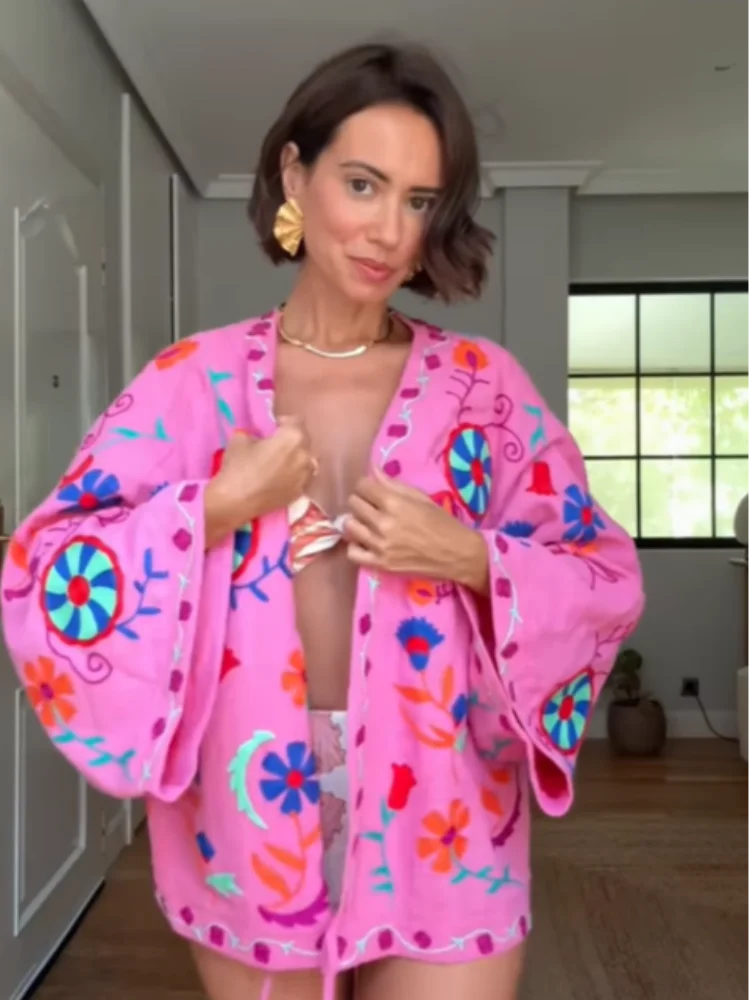 Chic Embroidery Pink Lace-Up Women's Short Coat – 2025 New Autumn Collection