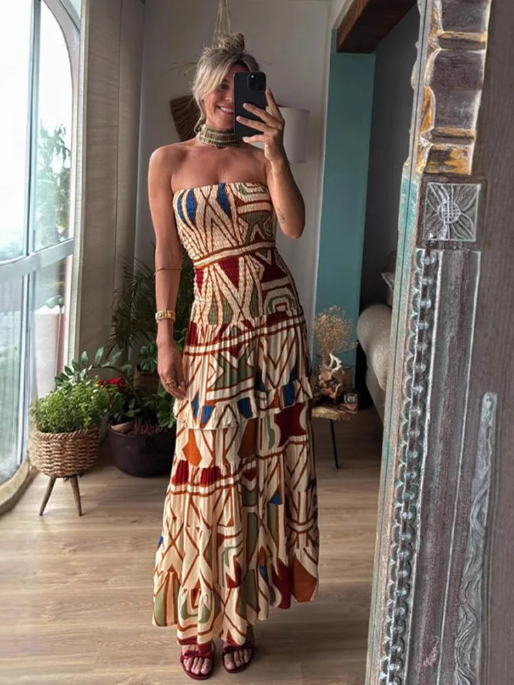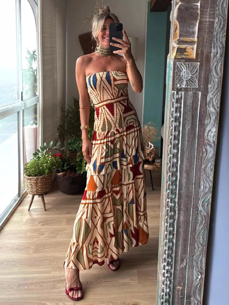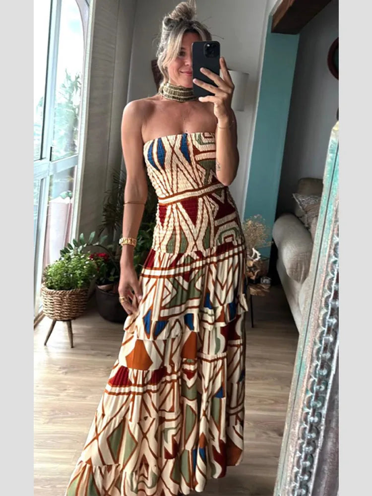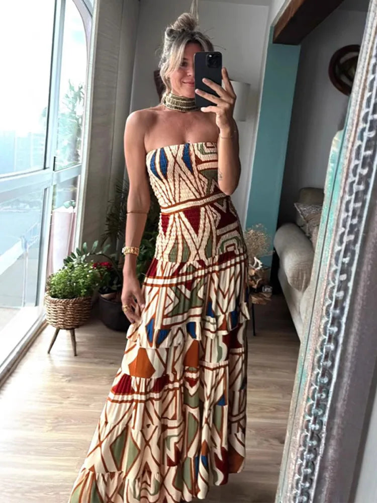 Fashion Printed Layered Curling Edge Patchwork Dresses Chic Full Sleeve Pleated U Neck Gown New Lady Vacation Highstreet Vestido