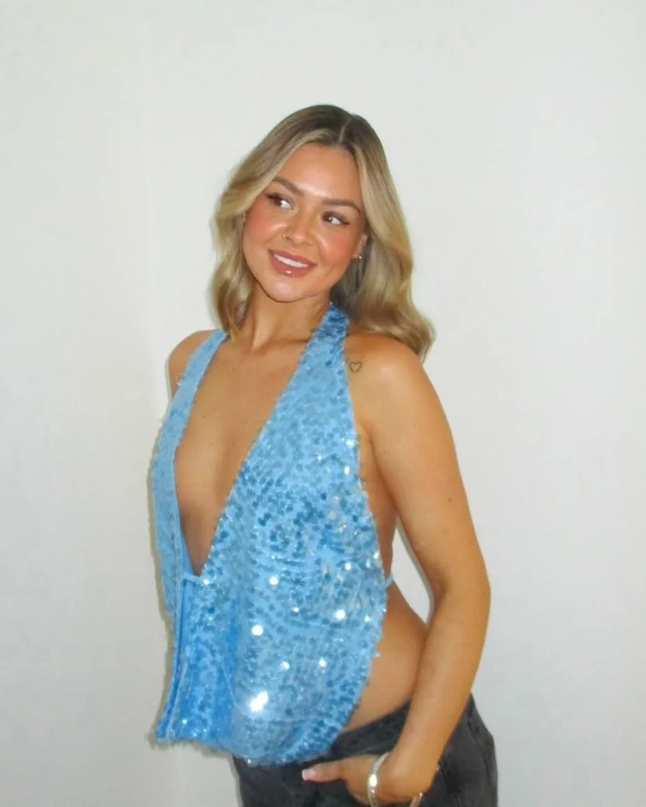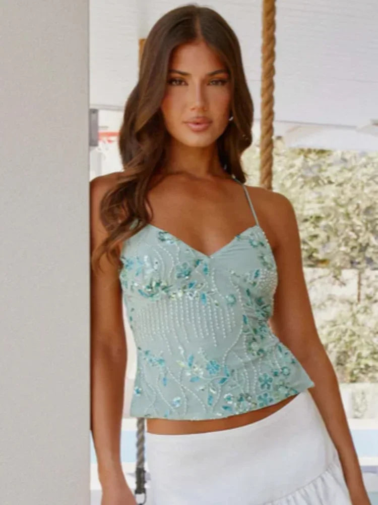 Fashion Solid Sequins Halter Crop Tops For Women Glitter Y2k Backless Lace-up Slim V Neck Top Summer Party Camisole Tank Shirts