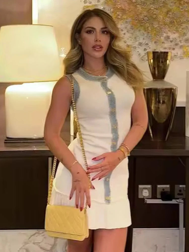 Women Elegant Denim Patchwork Single Breasted Mini Dress Fashion O Neck Sleeveless Single Breasted Vestido Chic Lady Street Wear