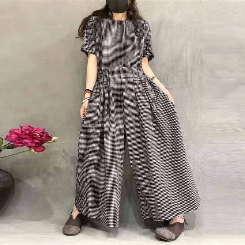 Short Sleeve Checked Wide Leg Overalls Pleated Waist O Neck Loose Casual Gingham Jumpsuits 2024 Fashion Women Long Romper